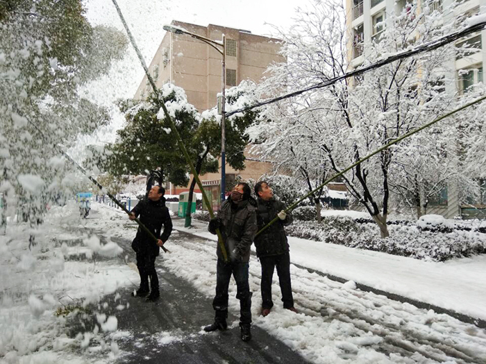 从4日开始,后勤集团及时启动扫雪铲冰应急预案,各中心职工及物业人员到岗就位,携带铁锨、竹竿等工具,冒着风雪,对路面积雪进行反复清扫。校园部分树木因大雪积压发生折断,物业人员自4日起不间断地对断枝进行清理,双休日不休息。绿化工人不间断地打落树上积雪,缓解被积雪压断枝状况,对倒伏树木进行了加固,确保校园主要道路、办公区、教学区、家属区等重点公共场所树木没有积雪。