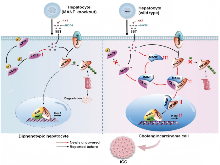 该研究发现,肝细胞来源的中脑星形胶质细胞源性神经营养因子MANF,通过与CK19的35位丝氨酸磷酸化位点结合,抑制CK19的磷酸化及其相关的膜转位,使CK19在胞质中滞留并与Notch2的胞内结构域NICD2的AR结构域相互作用,抑制NICD2降解并促进NICD2核信号转导,进而驱动肝细胞向ICC细胞谱系重编程,加快ICC进程。